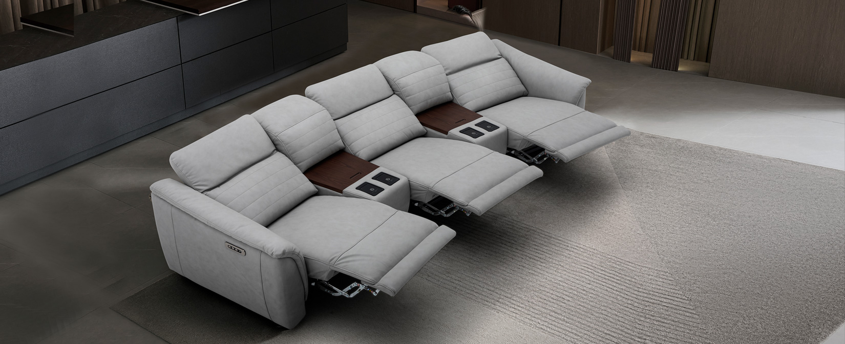 Electric lounge sofas paired with multimedia end tables , giving rise to a new living-area concept (Home theater) where flexibility merges with innovative comfort levels.